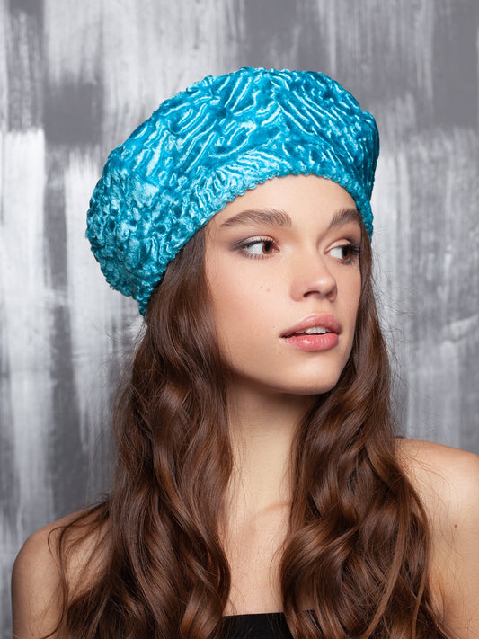Жіночий берет з еко-хутра – Каракуль Аквамарин