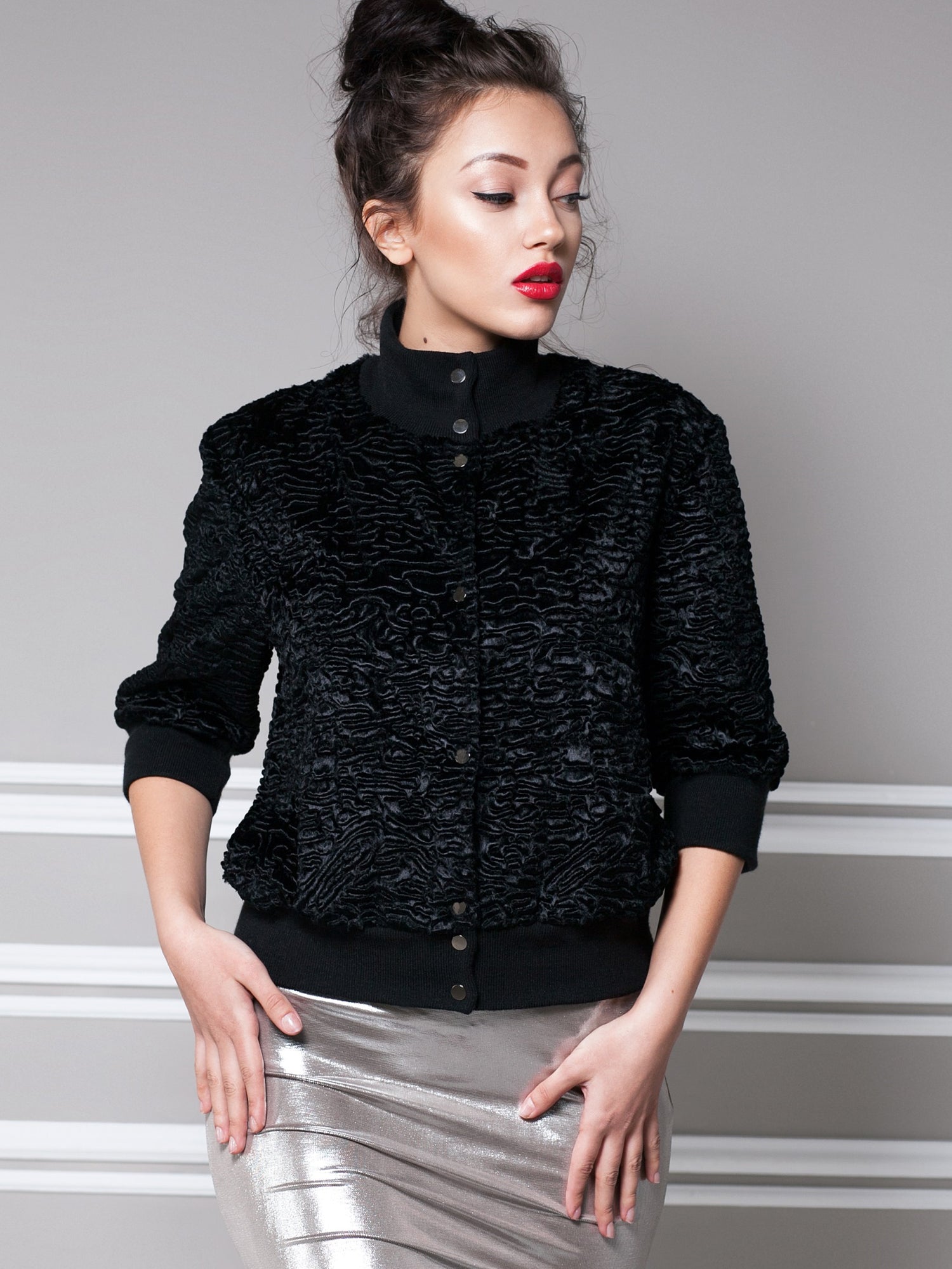 Жіночий бомбер з еко-хутра – Каракуль Обсидіан