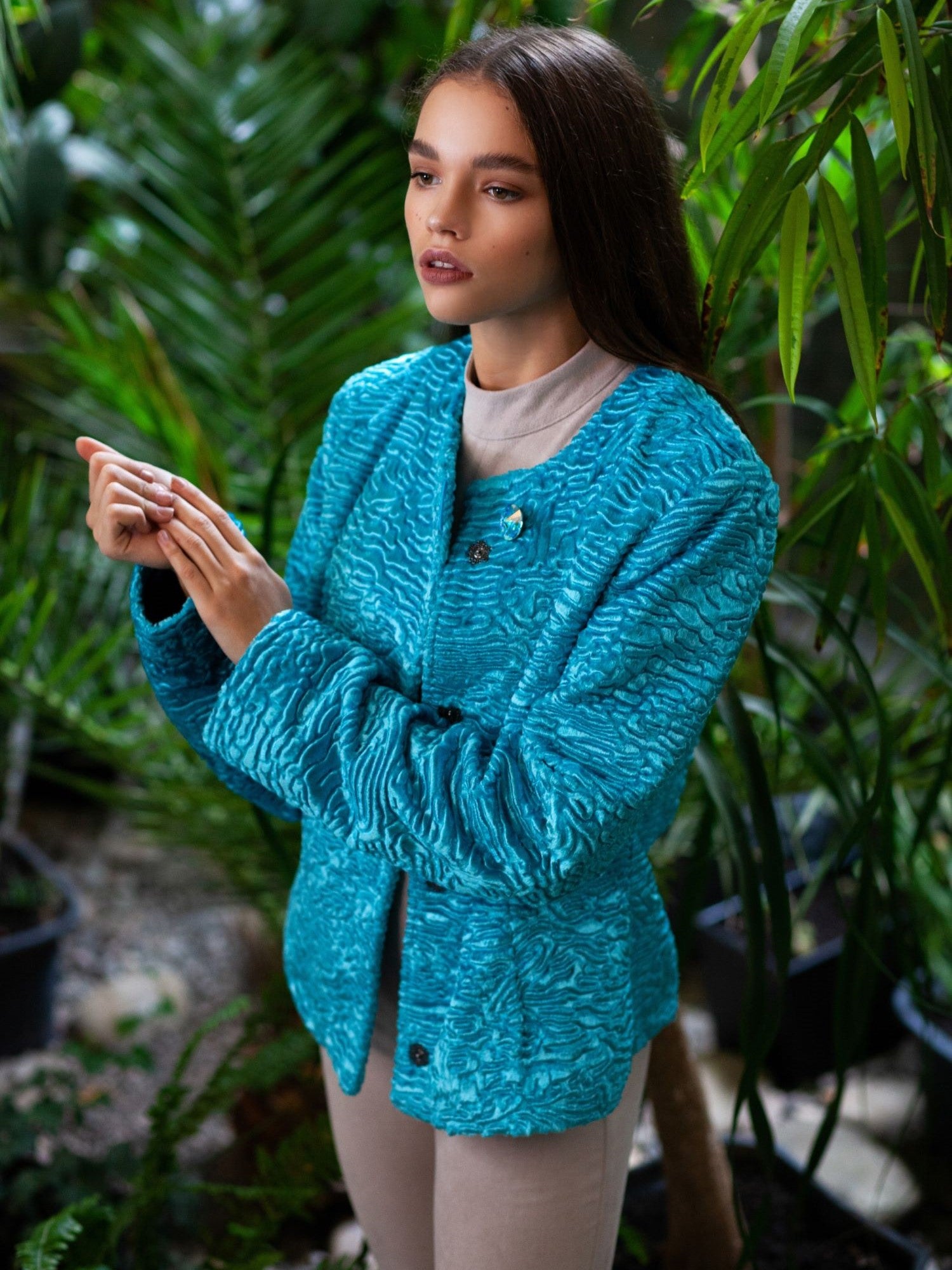 Жіноче пальто з еко-хутра – Каракуль Аквамарин